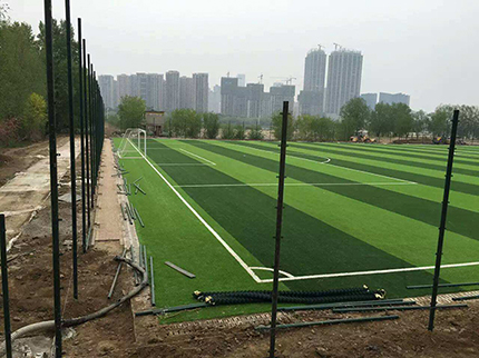 (2)足球場圍網(wǎng)畫線:比賽場地應按照平面圖畫出清晰的線條。線寬不得超過12厘米,不得做成\U+201CV\U+201D形凹槽。較長的兩條線叫邊線,較短的兩條線叫球門線。場地中間畫一條橫穿球場的線,叫中線。場地中央應當做一個明顯的標記,并以此點為圓心,以9.15米為半徑,畫一個圓圈叫中圈。場地每個角上應各豎一面不低于1.50米高的平頂旗桿,上系小旗一面;相似的旗和旗桿可以各豎一面在場地兩側(cè)正對中線的邊線外至少1米處。