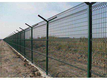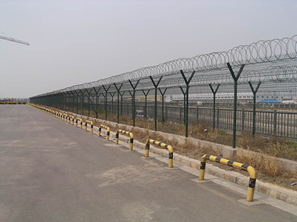 飛行區鋼筋網圍界一般采用5.0mm的優質低碳鋼絲焊接;網孔(mm) 50x100 50x150 50x200網片中帶有Y型加強筋可增強護欄網的抗沖擊力。立柱為60X60矩形鋼,頂端含有Y型支架或者采用70mmX100mm的掛式連接立柱,飛行區鋼筋網圍界網片鏈接采用特制SBS扣件,有效防止人為破壞性拆卸,產品均為熱鍍鋅后采用高質量的聚酯粉末靜電噴涂,采用國際流行的RAL顏色,飛行區鋼筋網圍界主要用途:機場封閉 、私人地域、軍事重地、 場區圍網、 開發區隔離網使用;